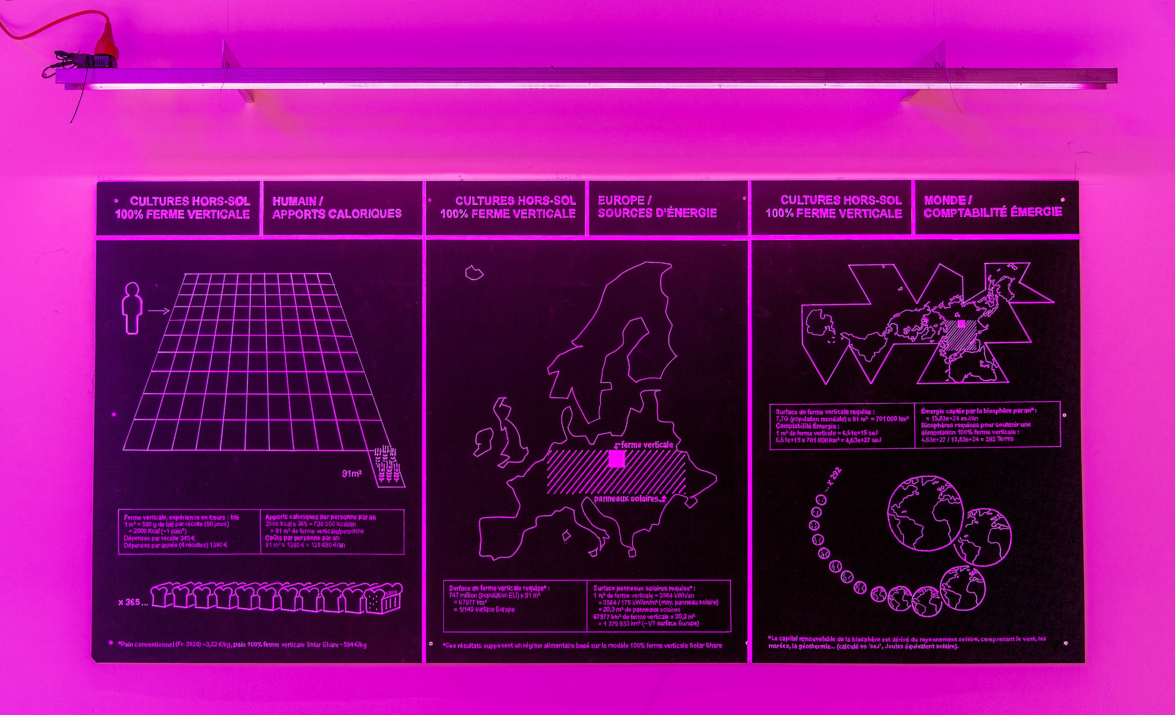 An art installation currently presented in Brussels - The Farm - explores what it would take to grow wheat in a vertical farm. For the experiment, 1 square meter of wheat was sown in a completely artificial environment. By measuring the input of raw materials such as energy and water, the project shows the extent to which natural ecosystems support our food production. When wheat is planted in the ground next to each other, instead of above, the sun provides free energy and the clouds free water.